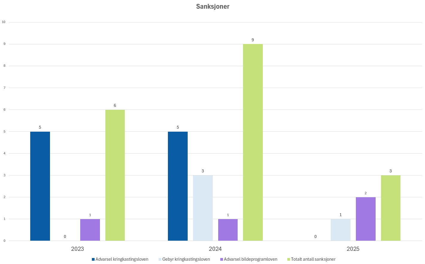 Det ble i 2025 gitt færre sanksjoner for brudd på kringkastingsregelverket enn i 2024. Dette kan skyldes at det ble gjennomført noe færre tilsynsaktiviteter. Sett i sammenheng med at det også ble avdekket noe færre brudd på regelverket i kontrollene for 2025 enn i 2024, kan dette også tyde på at tilbyderne har fått økt kjennskap og forståelse for regelverket. For Medietilsynet har det i en årrekke vært et mål aktivt å praktisere dialog og veiledning, slik at tilbydere i økende grad etterlever regelverket.