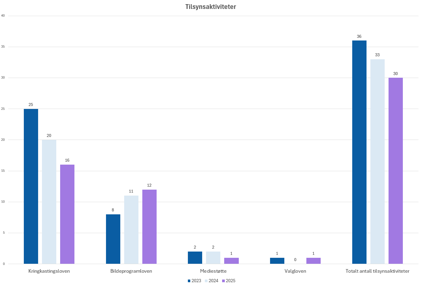 I 2025 ble det gjennomført 16 tilsynsaktiviteter etter kringkastingsregelverket, mot 20 i 2024 og 25 i 2023. Det har de siste årene frem til 2024 vært en økning, mens det i 2025 var en liten nedgang i tilsynsaktiviteter etter kringkastingsloven. Noe av årsaken til nedgangen det siste året var prioritering av arbeid med informasjonstiltak knyttet til nye regler i kringkastingsregelverket som trådte i kraft 1. mai 2025. Det var økt tilsynsaktivitet etter bildeprogramloven, og i tillegg ble tilsyn etter valgloven gjennomført i 2025.